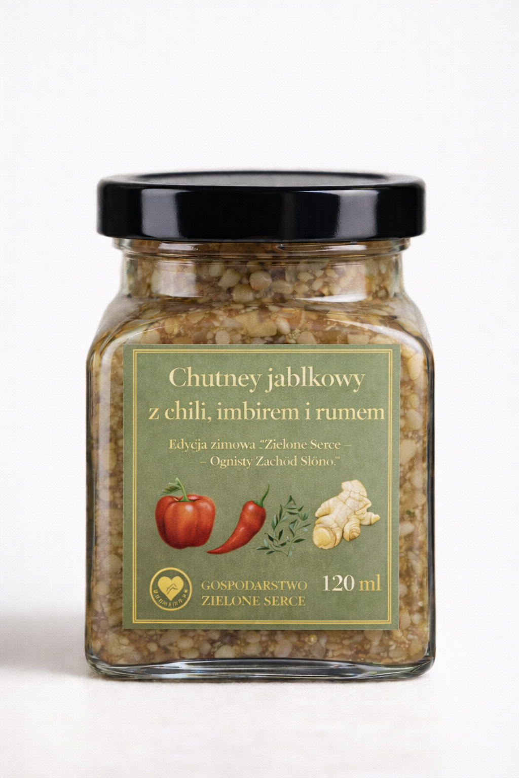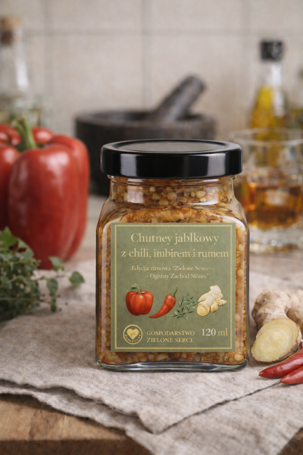 Ten chutney to zimowa kompozycja dla miłośników głębokich, rozgrzewających smaków. Bazą są jabłka, które w połączeniu z rumem, imbirem i chili tworzą wyrazistą, ale zbalansowaną całość – kwaśną, aromatyczną i przyjemnie rozgrzewającą.