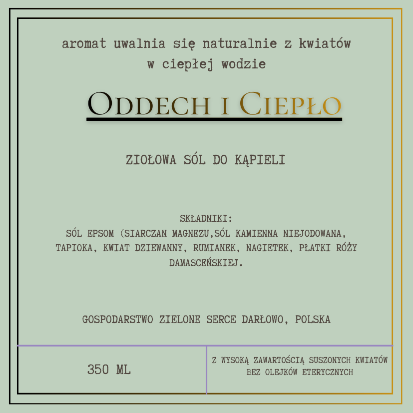 Oddech i Ciepło to głęboko ziołowa sól do kąpieli inspirowana tradycyjnymi kąpielami parowymi i ziołowymi. Jej aromat rozwija się stopniowo w ciepłej wodzie, tworząc atmosferę ciepła, spokoju i swobodnego oddechu.