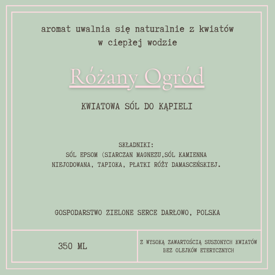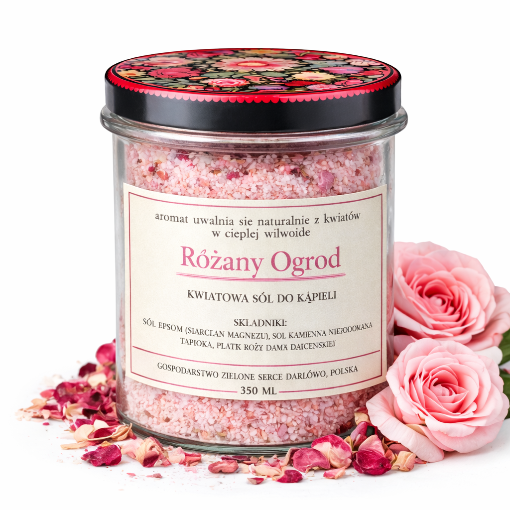 Różany Ogród to klasyczna, czysta kompozycja oparta na suszonych płatkach róży damasceńskiej. W ciepłej wodzie zapach rozwija się powoli i naturalnie, bez intensywności olejków eterycznych.