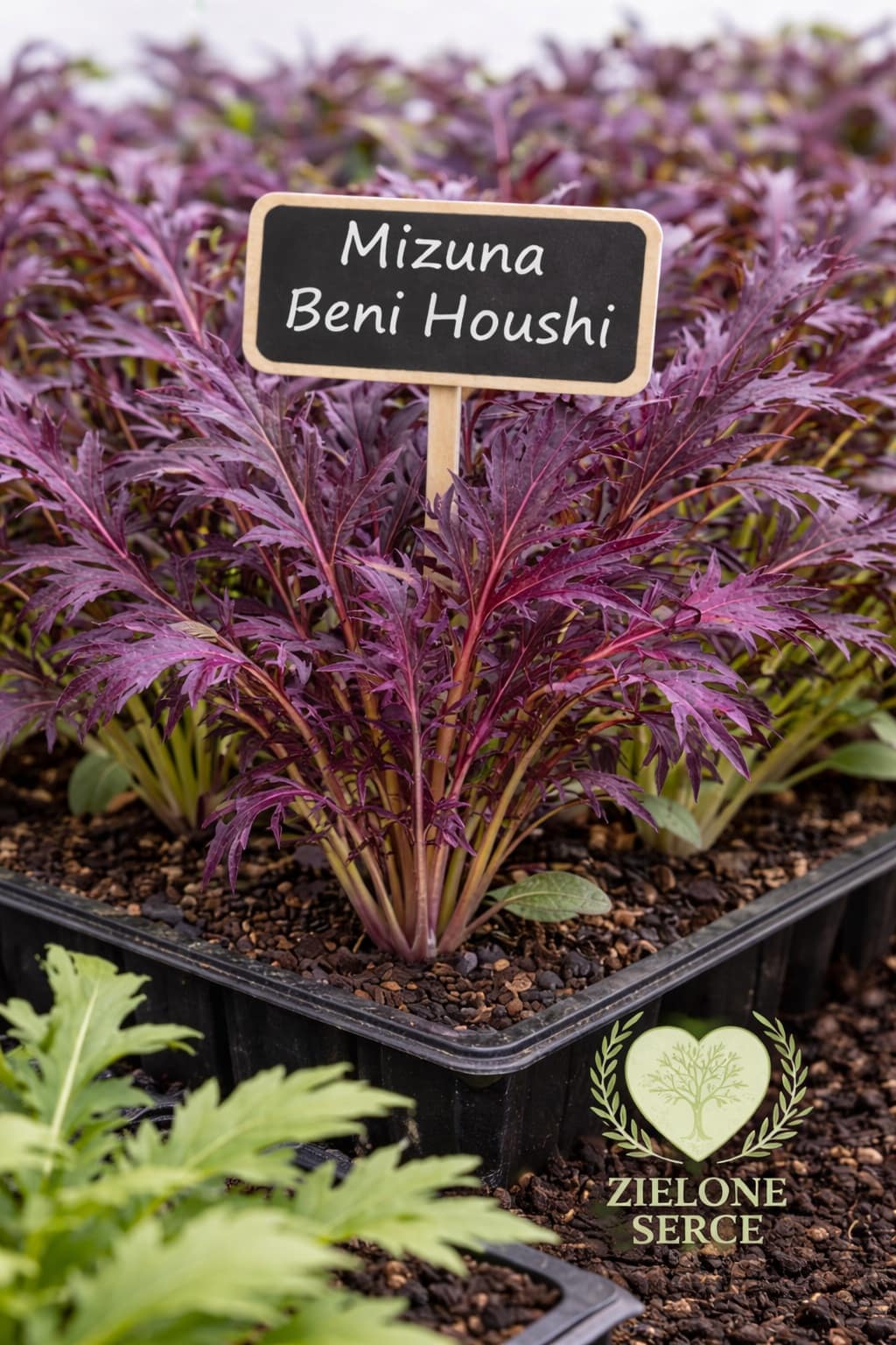 Mizuna Beni Houshi to czerwonolistna odmiana sałaty azjatyckiej, ceniona zarówno za walory smakowe, jak i dekoracyjny wygląd. Tworzy luźne rozety z delikatnie powcinanymi liśćmi w intensywnym, czerwono-purpurowym kolorze. Smak jest łagodnie musztardowy, lekko pikantny, ale nie ostry.